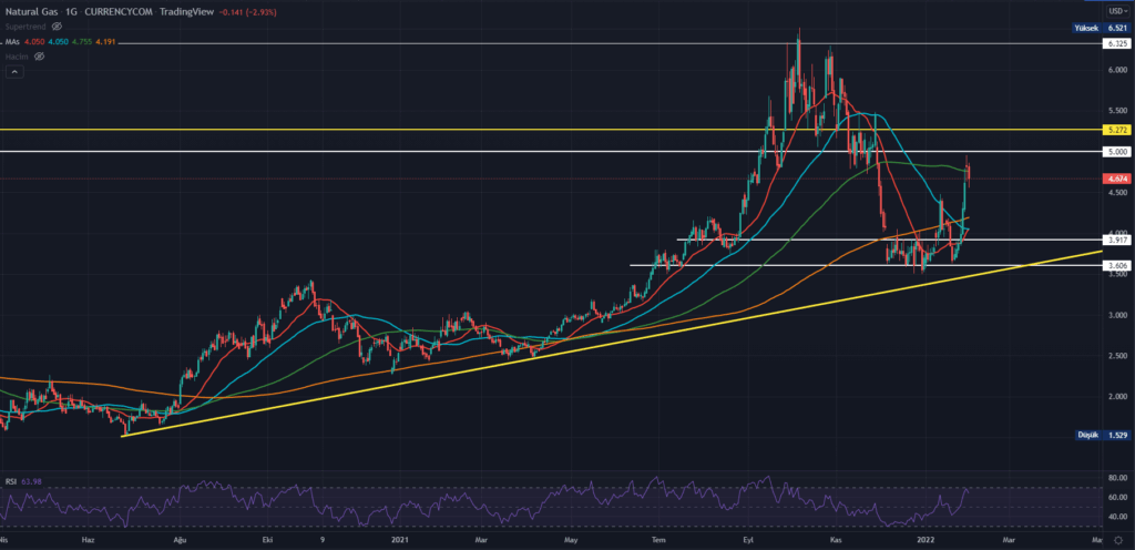 Moskova ve Batı ülkeleri arasında yükselen gerilim, Ukrayna’ya askeri müdahalede bulunması durumunda Rusya’ya şu ana kadarki en sert ekonomik yaptırımların uygulanması olasılığını artırıyor. Bunlardan en önemlisi, Rus finans siteminin SWIFT sisteminden koparılması olabilir. SWIFT para transfer talimatları gibi finansal talimatların gönderilmesinde ve alınmasında kullanılıyor. Daha önce SWIFT sisteminden çıkartılan ülkelerden biri İran. 2012 yılının Mart ayında Tahran’a nükleer programı nedeniyle uygulanan uluslararası yaptırımlar artınca SWIFT, İran bankalarıyla bağlantısını kesmişti. 200’den fazla ülkede 11 binden fazla finans kurumu tarafından kullanılan SWIFT sistemi, ülke bankalarının birbirleriyle olan bağlantısı konumunda. Bu durumdan en çok etkilenecek ülkelerin başında Rus bankalarıyla en sık SWIFT kullanan ABD ve Almanya yer alıyor. Rusya’ da SWIFT sisteminden çıkarılması halinde, 2014 yılında kurduğu kendi ödeme sistemi SPFS’ yi devreye alacaklarını ve Avrupa’ ya sağladıkları doğalgaz akışını keseceklerini açıkladılar. Avrupa, kullandığı doğalgazın %90′ ını ithal ediyor ve bunun da %65′ ini Rusya’ dan alıyor. Avrupa’ ya doğalgaz akışının kesilmesi, Avrupa’ yı ciddi bir enerji krizine sokabilir. Hatta uzmanlar günler süren elektrik kesintilerinin olabileceğini tahmin ediyor. ABD yönetimi ise, Ukrayna işgali durumunda uygulanacak yaptırımlara karşılık Rusya’nın doğal gazı kesmesi halinde Avrupa’nın ihtiyacının karşılanması için Asya, Orta Doğu ve Kuzey Afrika’daki doğal gaz üreticileri ile görüşüyor. Görüşülen ülkelerden birisi de Katar. ABD’nin talebi üzerine birkaç büyük üreticiyle birlikte AB ülkelerine gaz sağlama çalışmaları başlatan Katar’ın şartlarını AB’ye sunduğu belirtiliyor. Buna göre Katar 2018’de açılan tekel soruşturmasının sonlandırılmasını ve sağlanan gazın AB dışına satılmamasını talep ediyor. Avrupa’ nın Katar gibi ulaşım sorunu olan ve maliyetli bir ülkeden doğalgaz talep etmesi, Rusya tarafından sağlanan doğalgazın kesilmesi ihtimalinin ne kadar yüksek olduğunu da gösteren önemli bir işaret. Tüm bu beklentiler doğalgaz ve petrol fiyatlarını desteklemeye devam ediyor. Ana yükseliş trendi üzerinde devam eden doğalgaz dün 5 dolarlık majör direncini, kasım ayından beri ilk defa test etti. Buradan da kâr satışlarının geldiğini görüyoruz. Güncel olarak 4.67 seviyesinden işlem gören doğalgaz yeni bir yükseliş dalgası başlatabilir. Bunun için ilk olarak 5.00 direncini takip edeceğiz. Direncin aşılması, fiyatı ilk olarak 5.27 ve 5.60 seviyelerine çıkaracaktır. Asıl hedef ise 6.32 seviyesi olacaktır 4.40 ve 4.19 destekleri olası geri çekilmelerde alım fırsatı sunacak seviyeler olarak takip edilebilir.