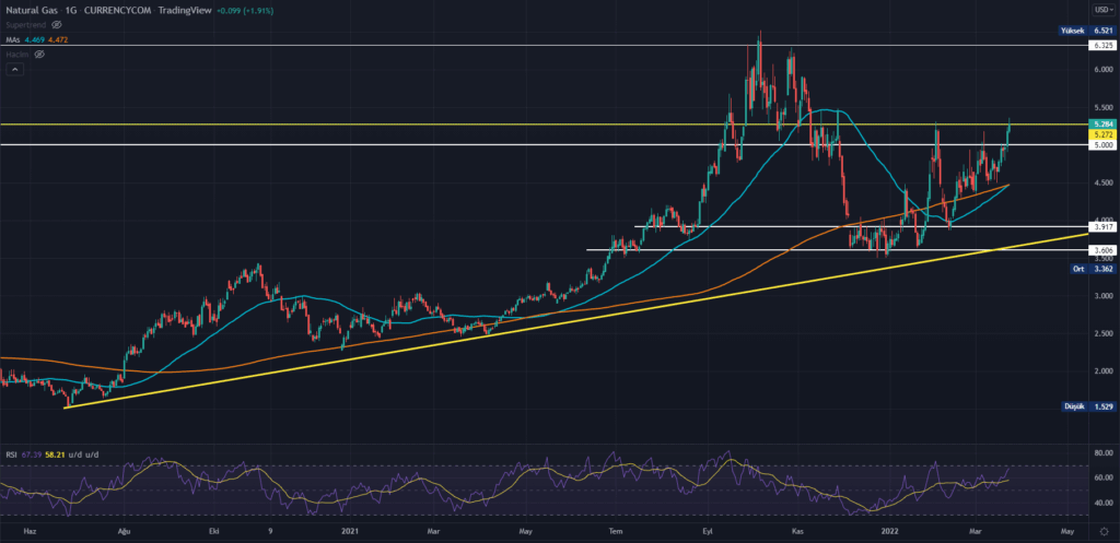 Rusya Devlet Başkanı Putin, bugün yaptığı açıklamada, “Dost olmayan ülkelere doğal gaz satışı ödemelerinde rubleye geçmeyi planlıyoruz.” dedi. Putin’in dost olmayan ülke sınıfına koyduğu ülkeler içinde AB ülkeleri, ABD, Japonya, İsviçre, Kanada, Birleşik Krallık gibi ülkeler bulunuyor. Hafta başında AB’nin Rusya’ya ambargo uygulayabileceği haberlerine yetkililerden yalanma gelse de bu olasılık kuvvetli görüldüğü için Putin’in açıklamaları sonrası doğalgazdaki yükseliş hızlandı. Yarın Avrupa ülkeleri ile görüşecek ABD Başkanı Biden’ın daha ağır yaptırımlar planladığı ve bunun için Avrupa’dan destek isteyeceği konuşuluyor. Doğalgaz satışında Ruble ile ödeme istenecek olması, fiyatı yükseltmeye devam edebilir. Satış yapılan ülkelerin Ruble’ ye ulaşımının kısıtlı olması, bu konuda zorlukların yaşanabileceğini gösteriyor. Haberin ardından son 4 ayın en yükseğine çıkan doğalgaz, kritik direnç olan 5.27 ye kadar geldi. Fiyatın bu seviyenin üzerine çıkması ve günlük kapanış yapması halinde 6.35 seviyesine kadar rahat bir hareket alanı olacaktır. Ayrıca bugünkü kapanışta 50 günlük ortalama, 200 günlük ortalamayı alttan keserek bir “golden cross” oluşturacak. Bu daha önce her olduğunda fiyat %10 üzerinde artış göstermişti. Bu da 6.35 hedefini doğrular nitelikte. Yükselişlerin devamı beklentilerine paralel olarak 6.35 dolarlık hedefimizi koruyoruz. 5.00 ise destek konumunda.